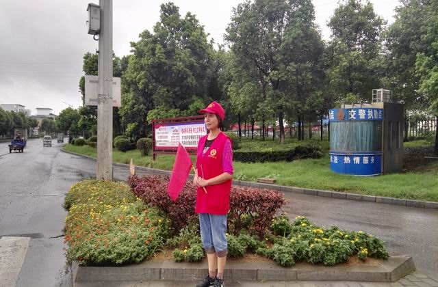 9月2日,枝城港志愿者放弃周末休息,在绵绵细雨中参加枝城镇丹阳路十字路口交通执勤,用实际行动为宜都创建文明城市助力。