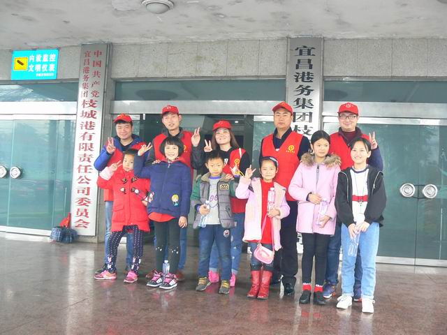 图为留守儿童与志愿者在枝城港办公楼前合影