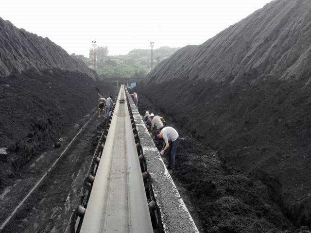 图为装卸一队清理皮带机沿线垮塌煤炭现场