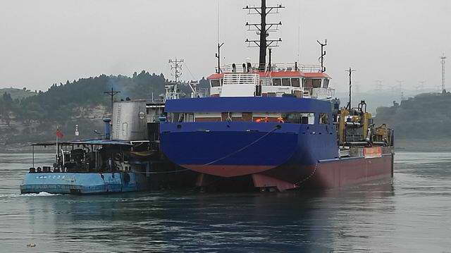 宜港拖2036轮成功拖带大型工程船出厂 2016-04-01 17:17 作者: 范宗超/图文 3月30日下午,宜昌达门船厂新造的一艘耙吸式挖泥船,在船墩大车的协助下缓缓下水,宜港拖2036轮在墩上进行了编队作业,为确保安全拖带,系缆采用了钢缆加尼龙绳的方式。该挖泥船完全放漂后,宜港拖2036轮船队起航驶往港区码头靠泊,在两小时时间内安全快捷完成此次特种拖带工作,再次展现了“宜港水军”的实力。 图为拖带现场