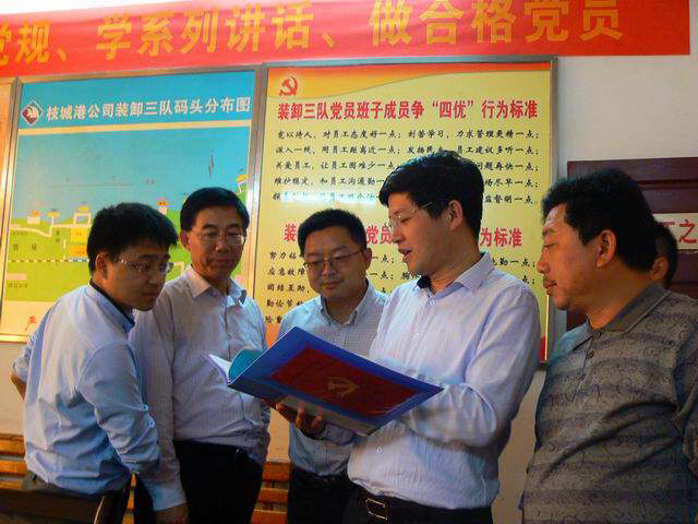 5月23日下午,宜昌市国资委党委委员、副主任曹红国,组织科科长刘玉平,副科长佘荣波一行到枝城港调研,并到市国资委“两学一做”学习教育联系点之一的枝城港装卸三队党支部检查指导“两学一做”学习教育。