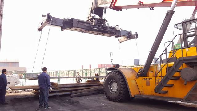 图为正面吊卸火车现场