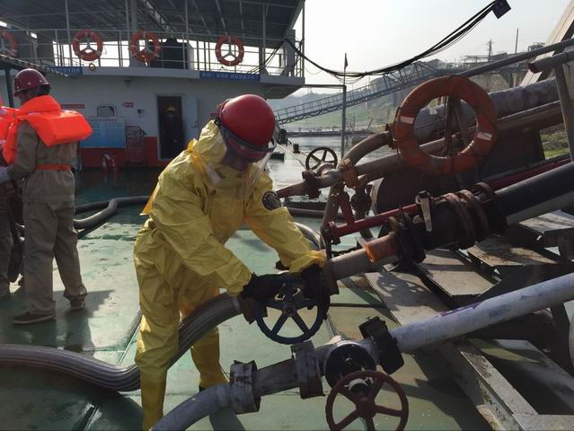 3月28日上午9时,枝城港装卸五队危化品码头正在进行硫酸接卸作业,“趸船与钢引桥硫酸软管与钢管接头处突然发生硫酸线状泄漏,硫酸喷溅到巡检员詹光进的面部、手部”,班长王长江立即启动应急预案,倾刻间一场人员救助和防泄漏、防污染应急处理演练随即在五码头现场展开。