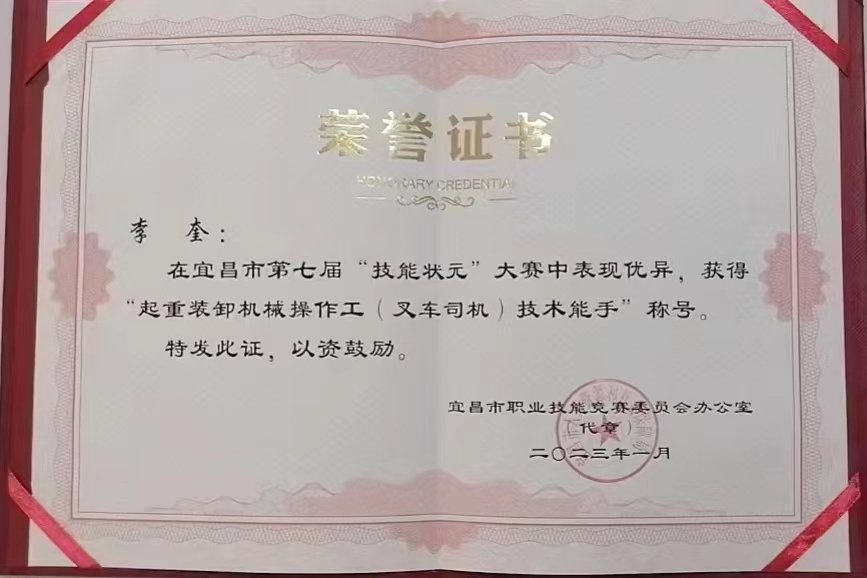 叉车司机项目的决赛于2022年9月20日在枝江市进行,面对竞争激烈的比赛,李奎沉着冷静,积极应对,发挥出高超的操作水平,以领先其他选手的速度优势,一路过关斩将,获得全市第3名的好成绩。根据大赛规则,被授予“起重装卸机械操作工(叉车司机)技术能手”称号。