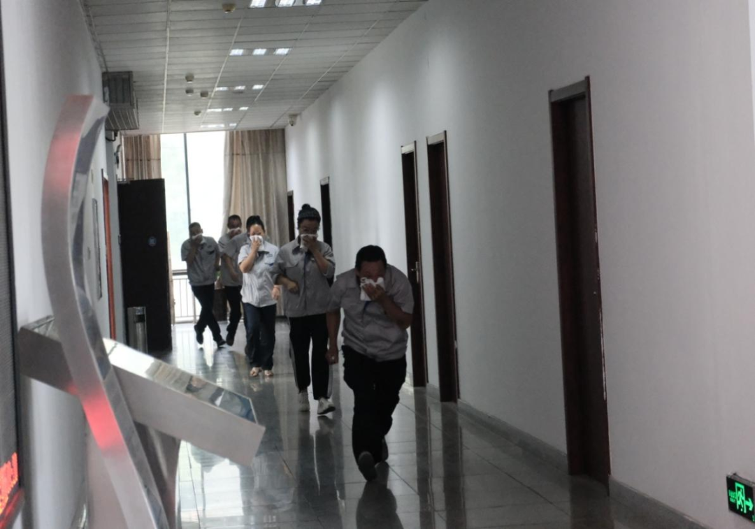 上午8点50分,应急疏散演练正式开始。当消防控制室接到火情警报后,公司义务消防队火速到达现场,在发现火势较大无法扑灭时,立即上报指挥部,总指挥夏茂想一声令下启动应急疏散预案,办公楼所有人员,在紧急疏散小组的引导下用毛巾捂住口鼻一路小跑,于2分钟内撤离完毕,整个演练过程迅速、安全、有序。