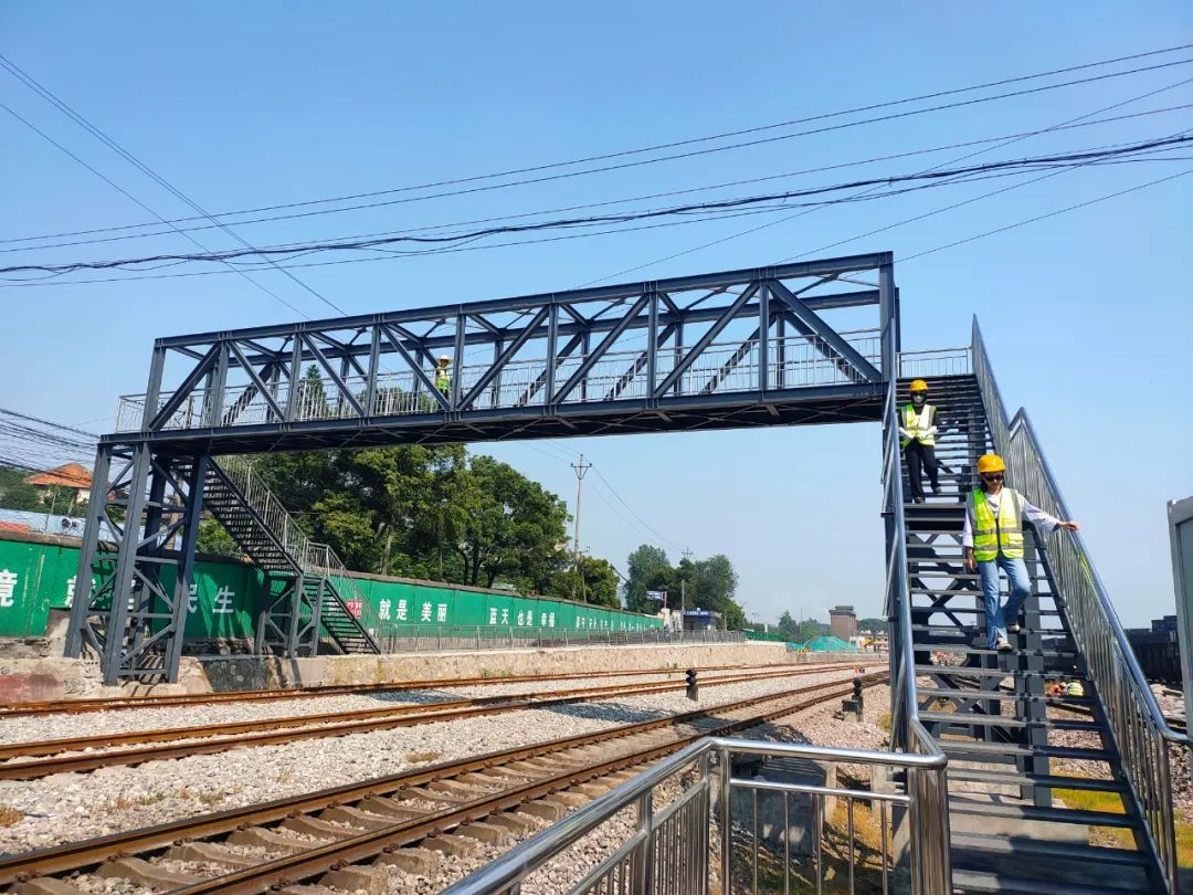 2022年,枝城港新增到发线技改项目建成后,原2#道口进出港通道封闭,职工进出港区需从西侧疏港通道处绕行。由于路途较远,职工穿越铁路线的情况时有发生,存在严重的安全隐患。为了解决职工安全通行问题,5月初,枝城港启动了人行天桥修建项目。该人行天桥采用桁架式结构,长约21米,跨越3条铁路线,建成后既能保证火车安全通行间距,又能方便港区人员进出,同时可利用原2号道口门房,对进出港区人员进行管控。