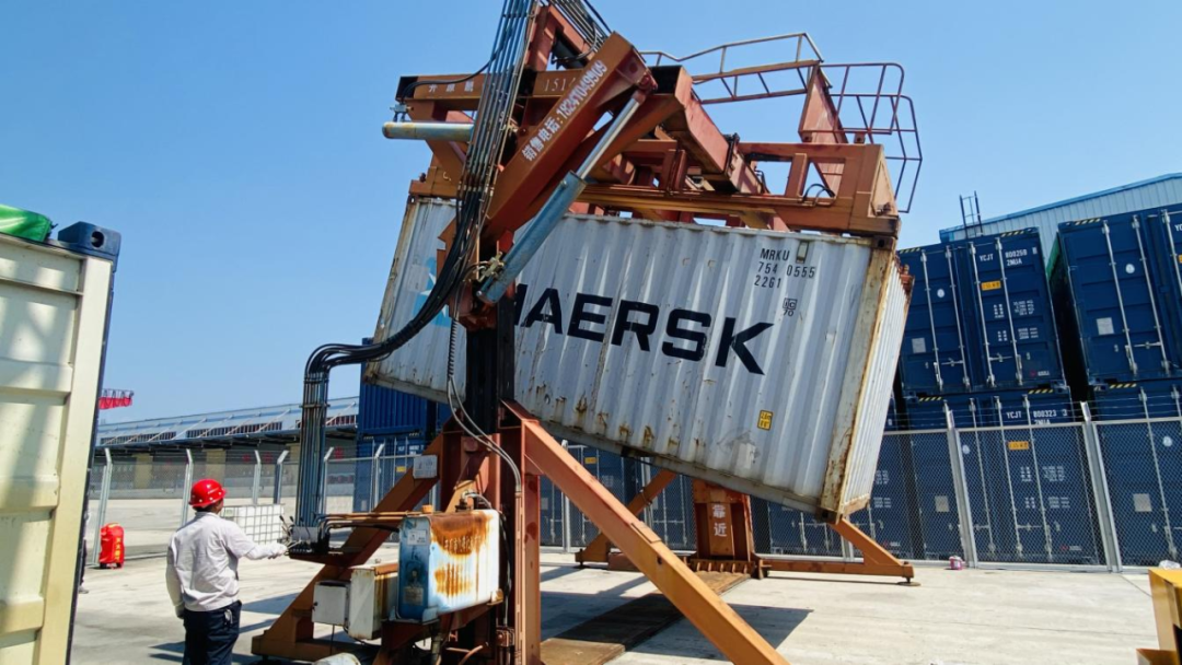 通过对港口作业能力及货物特性的研讨分析,设备部决定对闲置的集装箱翻转机进行修复,并采用吊车起吊、空中破包的方式进行装箱作业,提高作业效率的同时降低作业成本。待一切准备就绪,集装箱被点对点固定在翻转机上倾斜,吊车将吨袋悬挂在箱门正上方,再由工人用刀片割破吨袋。在重力作用下,吨袋中的化工原料颗粒不剩地流入集装箱中,仅一个工时就完工了5箱装箱作业。相较于流动设备平移装箱,作业效率提升一倍以上,货损大幅降低,基本实现零货损,超标准达成客户作业计划。