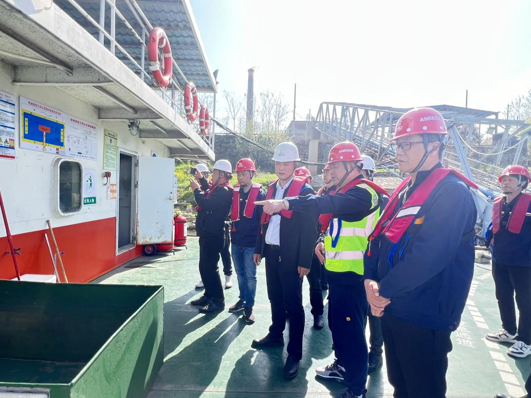 殷伟一行先后来到宜港集团枝城港和白洋港进行现场调研。在枝城港现场重点查看危化码头双重预防机制运行、物料管道输送线路及设备日常安全操作、应急处置、趸船管理等工作开展情况。随后在铁水联运码头,现场查看码头前沿风险分级管控措施落实、环保设施运行等环节管理情况,并详细了解枝城港专用铁路扩能改造和铁水联运码头二期工程两大项目建设进展情况。